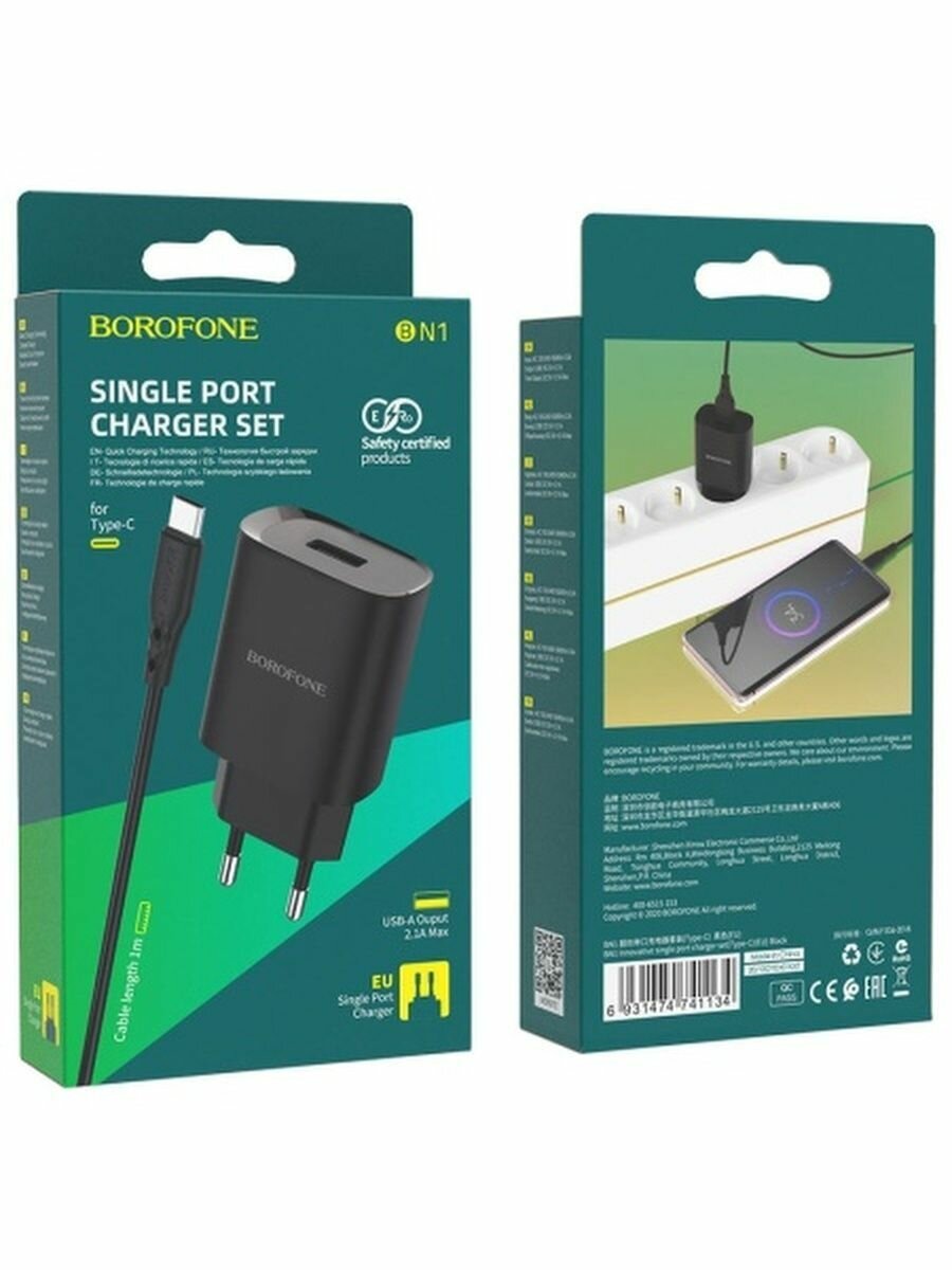 Сетевое зарядное устройство BOROFONE BN1 Innovative 1xUSB с Кабелем USB - Type-C, 2.1A, черный