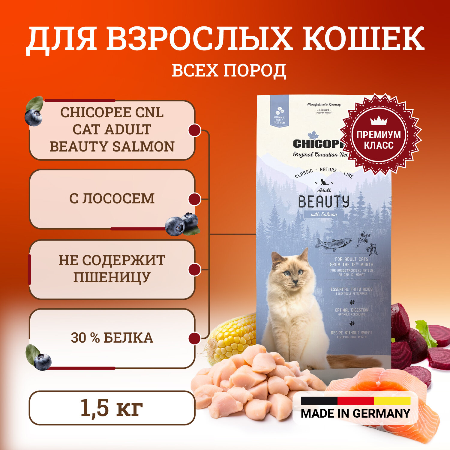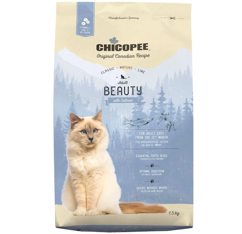 CHICOPEE CLASSIC NATURE LINE CAT ADULT BEAUTY для взрослых кошек с чувствительной кожей и шерстью с лососем (1,5 кг)