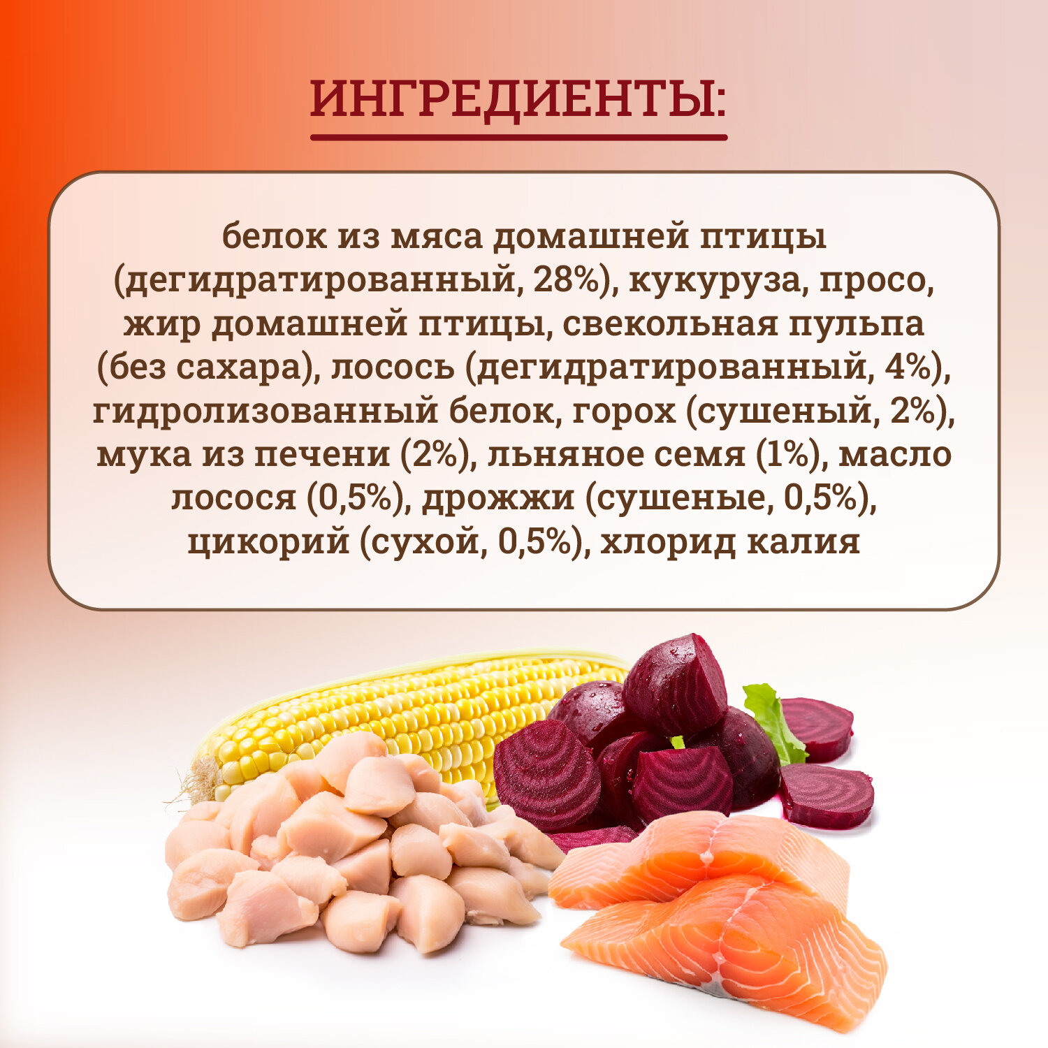 | Состав | белок из мяса домашней птицы (сушеный, 28%), кукуруза, сорго, птичий жир, жом свеклы (сахар удален), лосось (сушеный, 4%), гидролизованный белок, горох (сушеный, 2%), мука из печени (2%), льняное семя (1%), лососевое масло (0,5%), дрожжи (сушеные, 0,5%), цикорий (сушеный, 0,5%), хлорид калия |