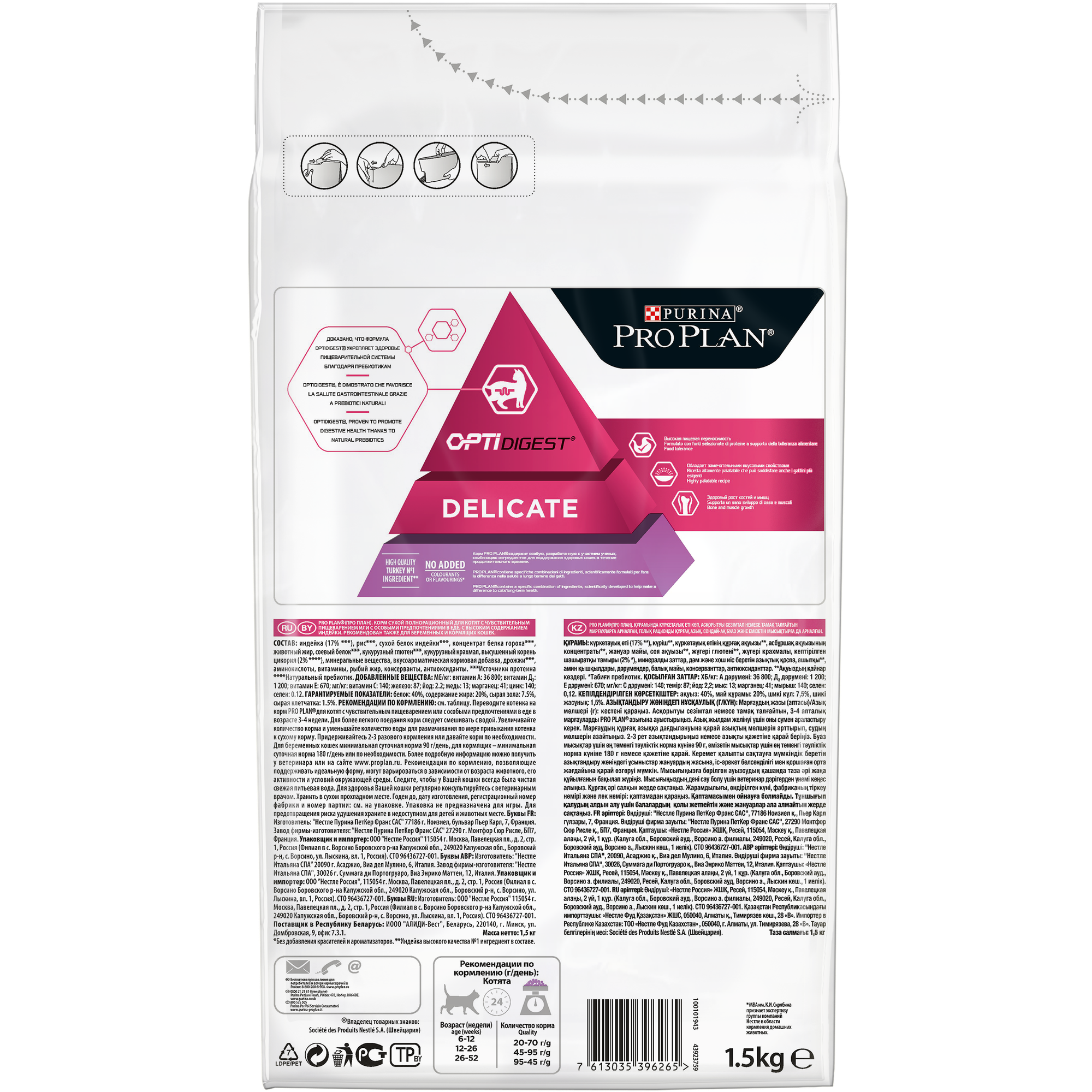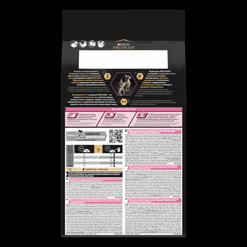 | Дополнительная информация | переводите котенка на корм PRO PLAN Junior Delicate в возрасте 3‐4 недели; для более легкого поедания корм следует смешивать с водой; постепенно уменьшайте количество добавляемой для размачивания воды до того момента, когда котенок сможет есть не размоченный корм; придерживайтесь 2-3 разового кормления или давайте корм по необходимости; для беременных кошек минимальная суточная норма 90 г/день, для кормящих — минимальная суточная норма 180 г/день или по необходимости; рекомендации по кормлению, позволяющие поддерживать идеальную форму, могут варьироваться в зависимости от возраста животного, его активности и условий окружающей среды; следите, чтобы у вашей кошки всегда была чистая, свежая питьевая вода |