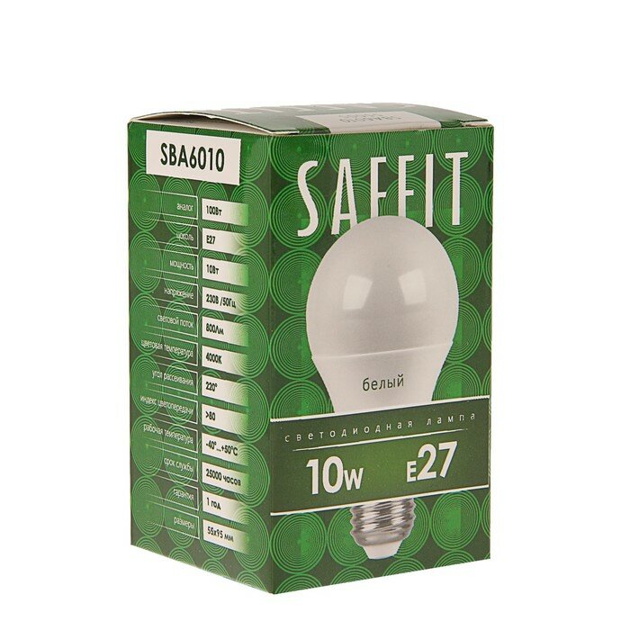 Лампа светодиодная SAFFIT SBA6010, A60, E27, 10 Вт, 230 В, 4000 К, 800 Лм, 220°, 108 х 60 мм 4335696