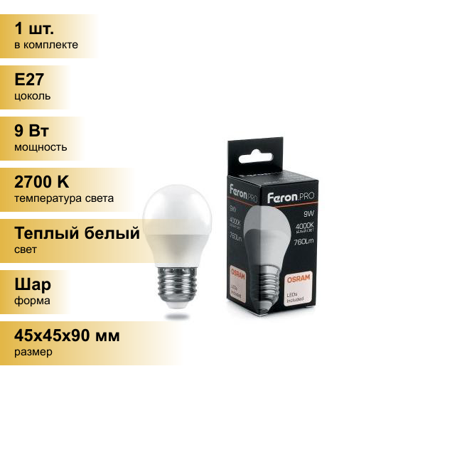 Светодиодная лампа FERON PRO LB-1409 Шарик E27 9W 2700K OSRAM LED 38080