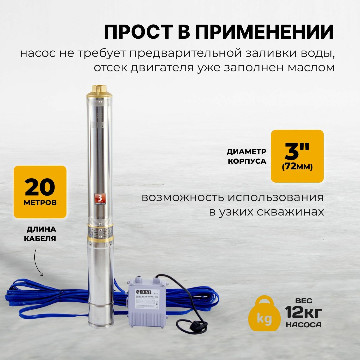 Скважинный насос DENZEL DWC-3-60, центробежный, диаметр 3, 800 Вт, 3300 л/ч, напор 60 м