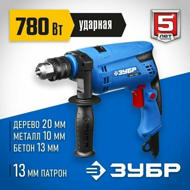 Зубр Дрель удар, Зубр Профессионал ЗДУ-780 ЭРМ2, патрон 13 мм, реверс, d: сталь-10 мм/Бетон-13 мм/дерево-20 мм, 0-3000 об/мин, 0-48000 уд/мин, 780 Вт ЗДУ-780 ЭРМ2