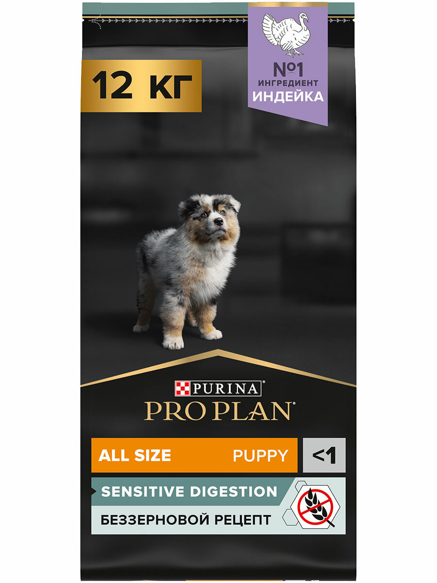 Purina Pro Plan Сухой беззерновой корм для щенков средних и крупных пород с чувствительным пищеварением с индейкой, 12кг
