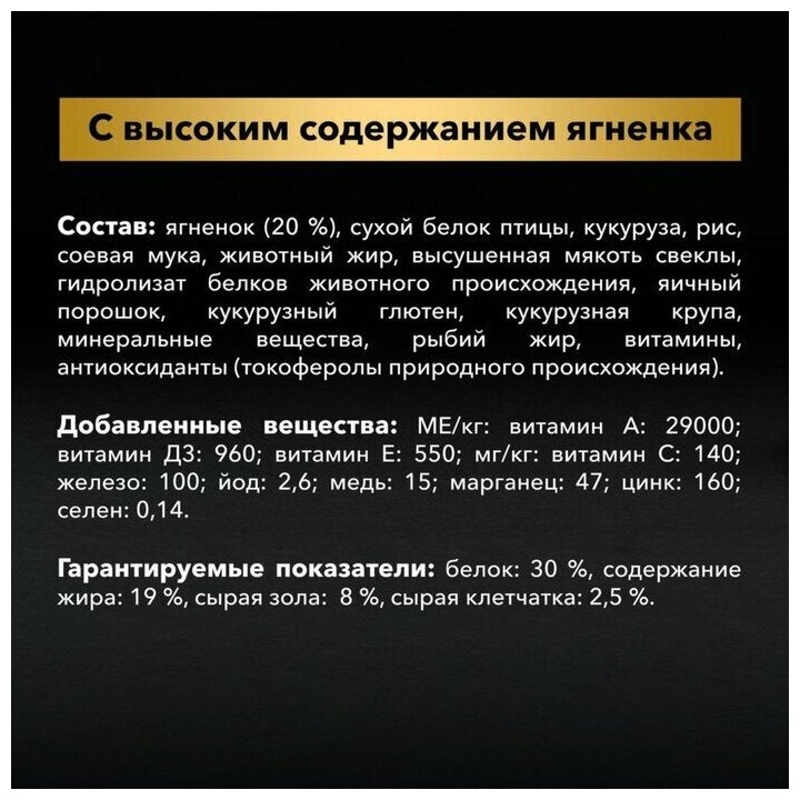 | Состав | ягненок 21%, кукуруза, кукурузный глютен, сухой белок птицы, рис 8%, животный жир, кукурузная мука, вкусоароматическая кормовая добавка, сухая мякоть свеклы, минеральные вещества, яичный порошок 1,9%, рыбий жир, витамины, молозиво 0,1%, антиоксиданты |