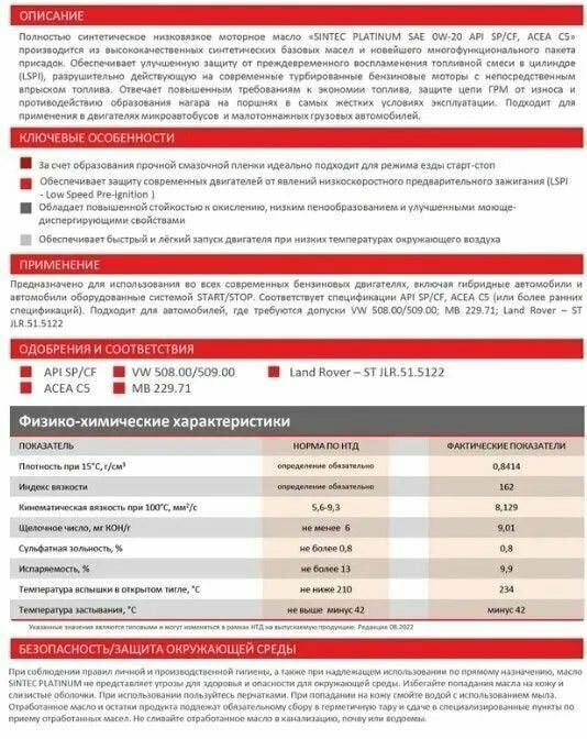SINTEC PLATINUM 0w20 API SP/CF ACEA C5 1л синт. мотор. масло API SP/CF ACEA C5 VW 508.00/VW 509.00 MB 229.71 Land Rover - ST JLR.51.5122