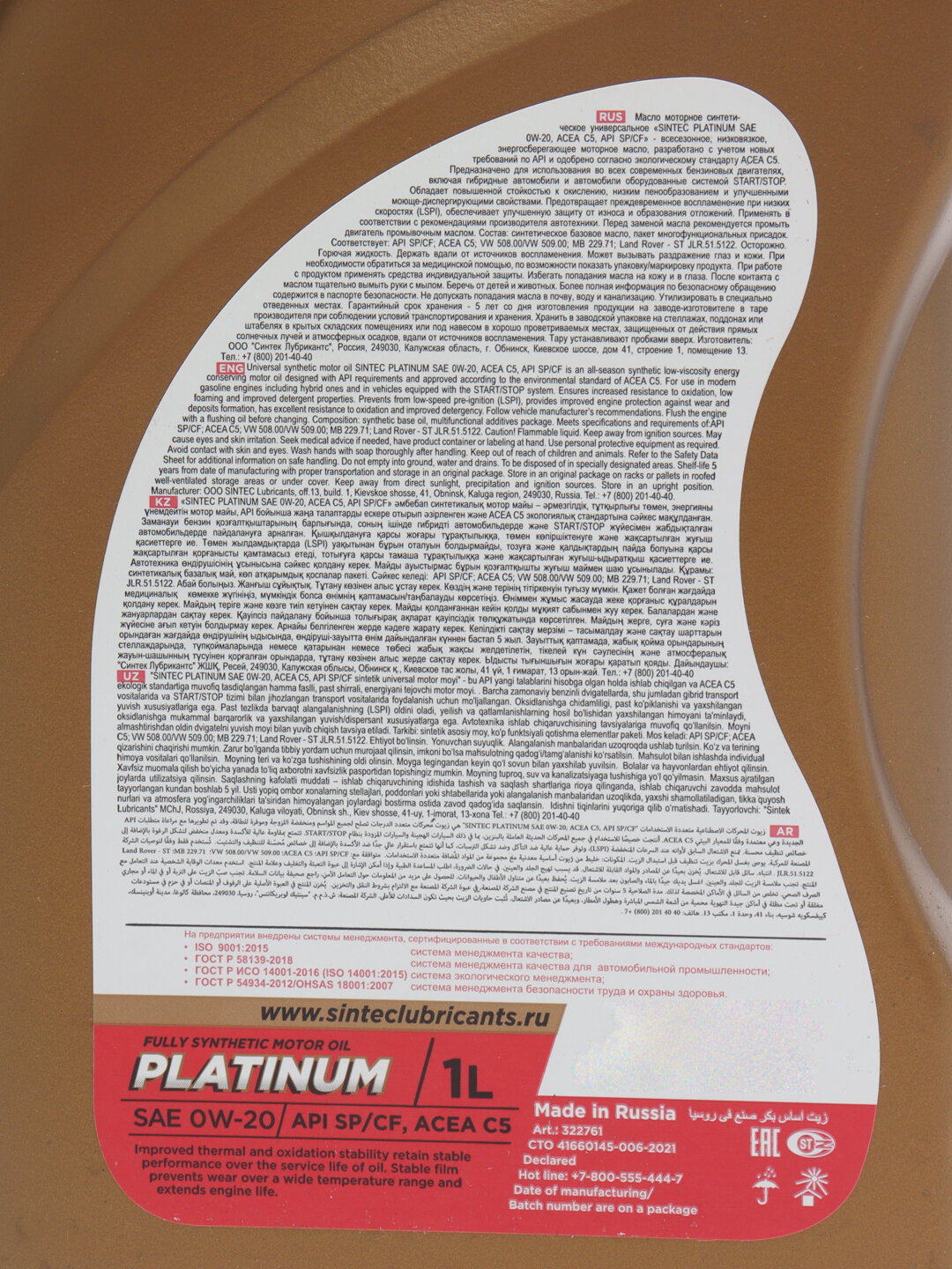 SINTEC Sintec Platinum Sae 0W-20 Api Sp/Cf, Acea C5 1Л
