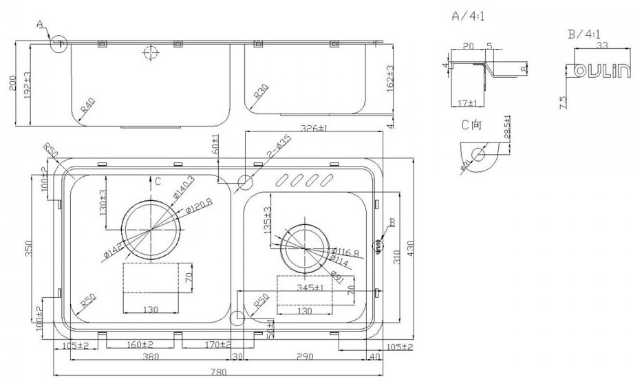 Мойка нержавеющая для кухни OULIN 780х430 OL-H9903