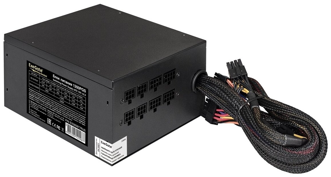 Блок питания 1200W ExeGate Gaming Standard 1200PGS (ATX, APFC, КПД 82% (80 PLUS), 14cm fan, 24pin, 2x(4+4)pin, 6xPCI-E, 8xSATA, 4xIDE, Cable Management, black, RTL) EX285977RUS