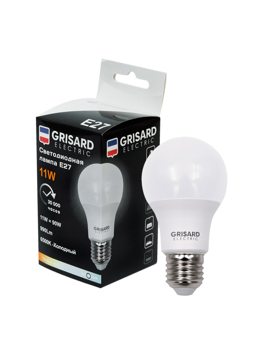 Лампа светодиодная GRISARD ELECTRIC шар A60 Е27 11Вт 6500К 220В, 1шт