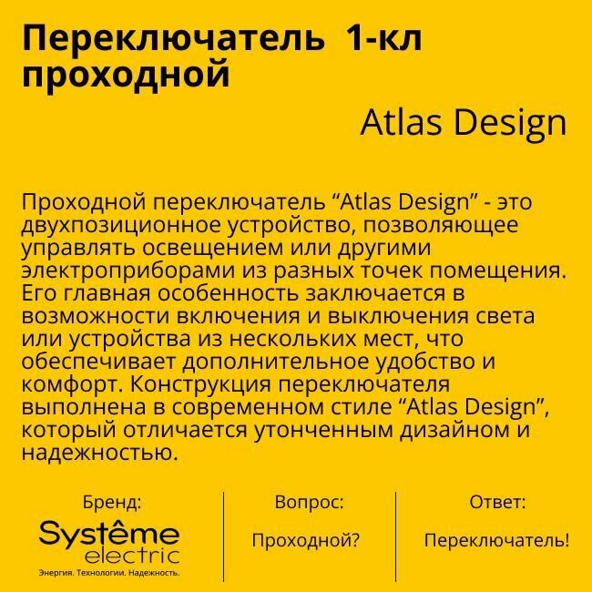 Ниже Вы можете прочитать отзывы на Переключатель проходной Systeme Electric Atlas Design 1-клавишный, 10А, 10 AX, Грифель - 2 шт., ознакомится с подробными характеристиками, посмотреть интересные обзоры и фотографии на Переключатель проходной Systeme Electric Atlas Design 1-клавишный, 10А, 10 AX, Грифель - 2 шт..