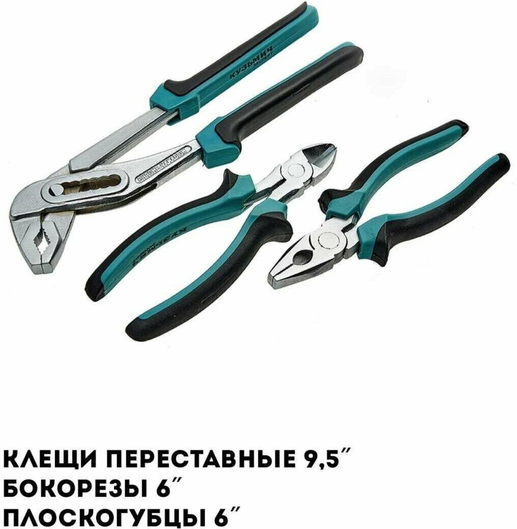 | Шарнирно-губцевый инструмент подробно | клещи переставные 9,5"; бокорезы 6"; плоскогубцы 6" |