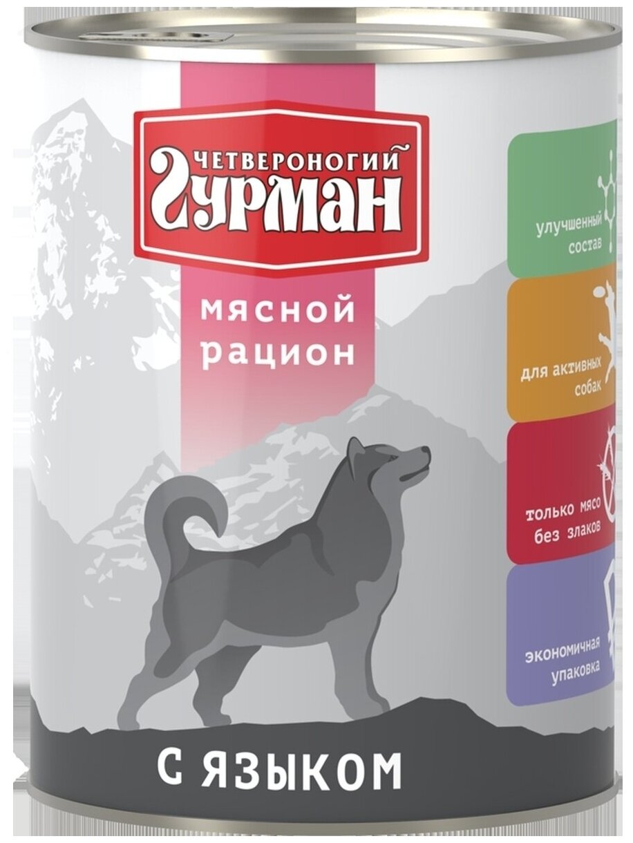 Влажный консервированный корм Четвероногий гурман для собак, Мясной рацион с языком, 850гр, 6шт