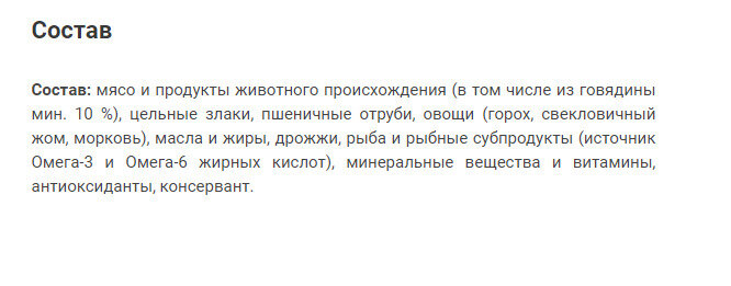 | Состав | Мясо и продукты животного происхождения (в том числе из говядины мин. 10 %), цельные злаки, пшеничные отруби, овощи (горох, свекловичный жом, морковь), масла и жиры, дрожжи, рыба и рыбные субпродукты (источник Омега-3 и Омега-6 жирных кислот), минеральные вещества и витамины, антиоксиданты, консервант. |