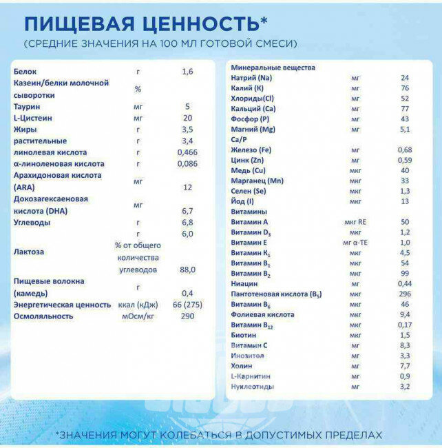 | Состав | лактоза, обезжиренное молоко, смесь растительных масел (пальмовое, рапсовое, кокосовое, подсолнечное, масло из Mortierella alpina), мальтодекстрин, загуститель – камедь рожкового дерева, источники минеральных веществ (кальция карбонат, железа сульфат, цинка сульфат, меди сульфат, марганца сульфат, калия йодид, селенит натрия), рыбий жир, источники витаминов (L-аскорбиновая кислота, L-аскорбат натрия, DL-альфа-токоферола ацетат, никотинамид, фолиевая кислота, D-пантотенат кальция, ретинола пальмитат, DL-альфа-токоферол, D-биотин, тиамина гидрохлорид, цианокобаламин, холекальциферол, пиридоксина гидрохлорид, фитоменадион), L-цистеин, эмульгатор – соевый лецитин, таурин, нуклеотиды (уридина 5-монофосфата натриевая соль, цитидина 5-монофосфат, аденозина 5-монофосфат, инозина 5-монофосфат натриевая соль, гуанозина 5-монофосфата натриевая соль), холина хлорид, инозитол, L-карнитин |