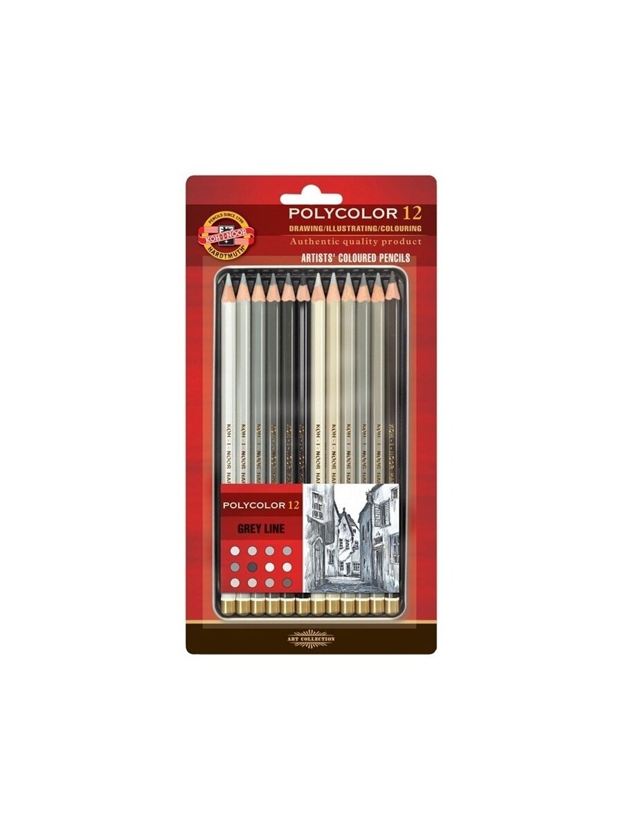 Карандаши цветные художественные Koh-I-Noor "Polycolor Grey Line", 12цв., заточен., металл. пенал, блистер, 324528