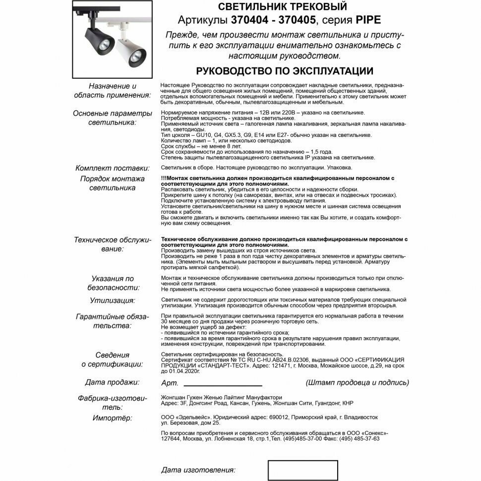 Светильник трековый однофазный трехжильный Novotech 370405 PIPE