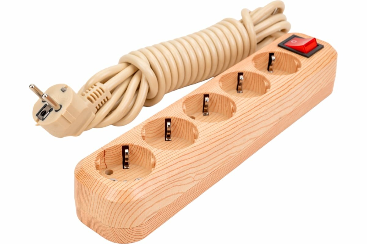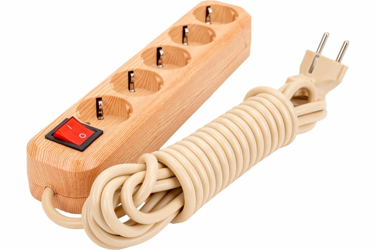 Удлинитель бытовой У05В выключатель, 5 гнезд, 5метров,2П+3, ПВС 3х1мм2 «Эко» (сосна) 16А/250В TDM