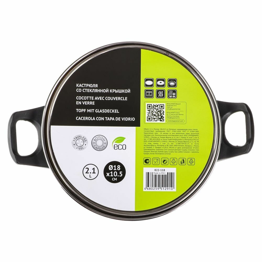 Кастрюля 18х10,5см, 2,1л, со стекл. крышкой Стрейтон