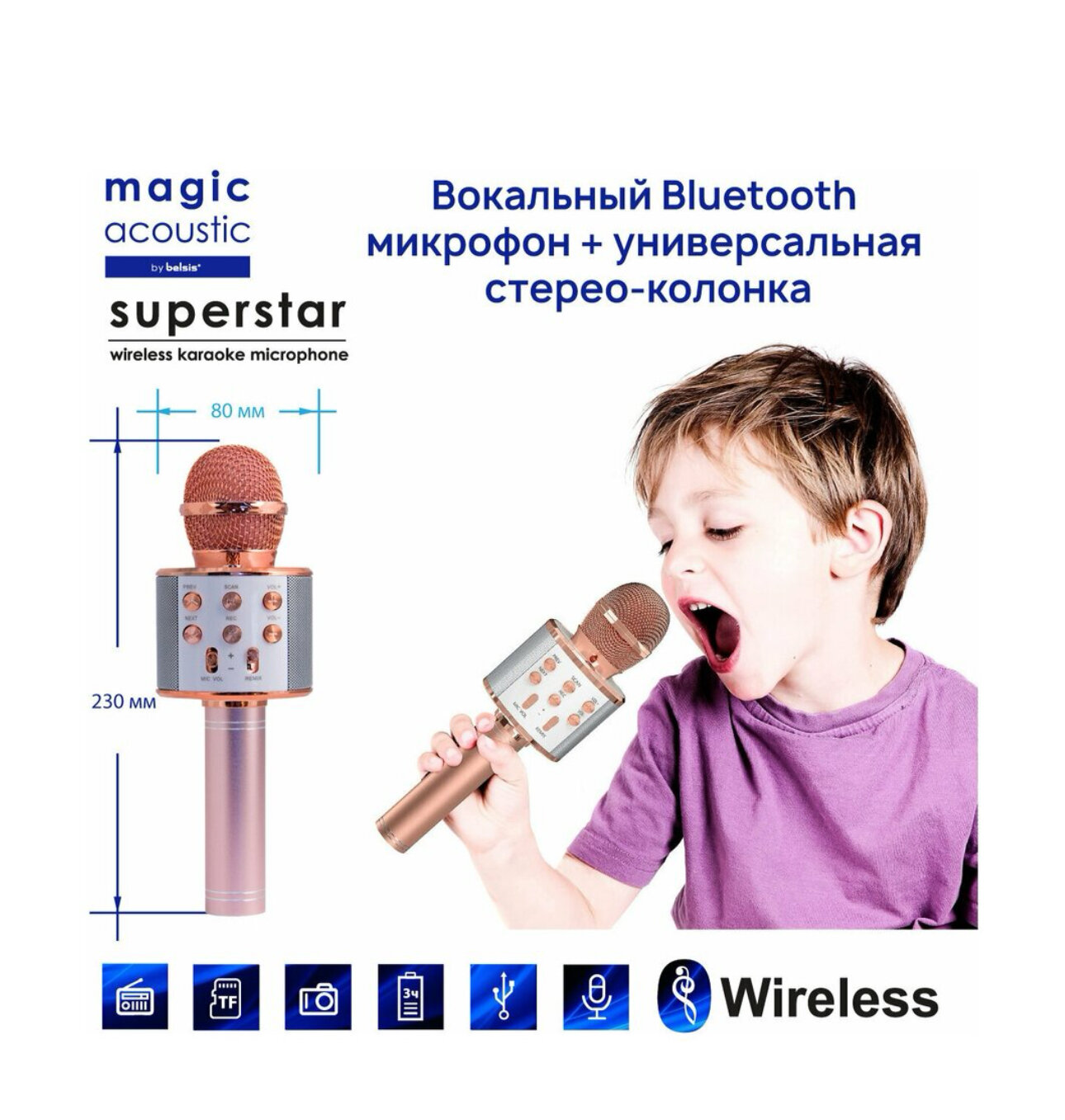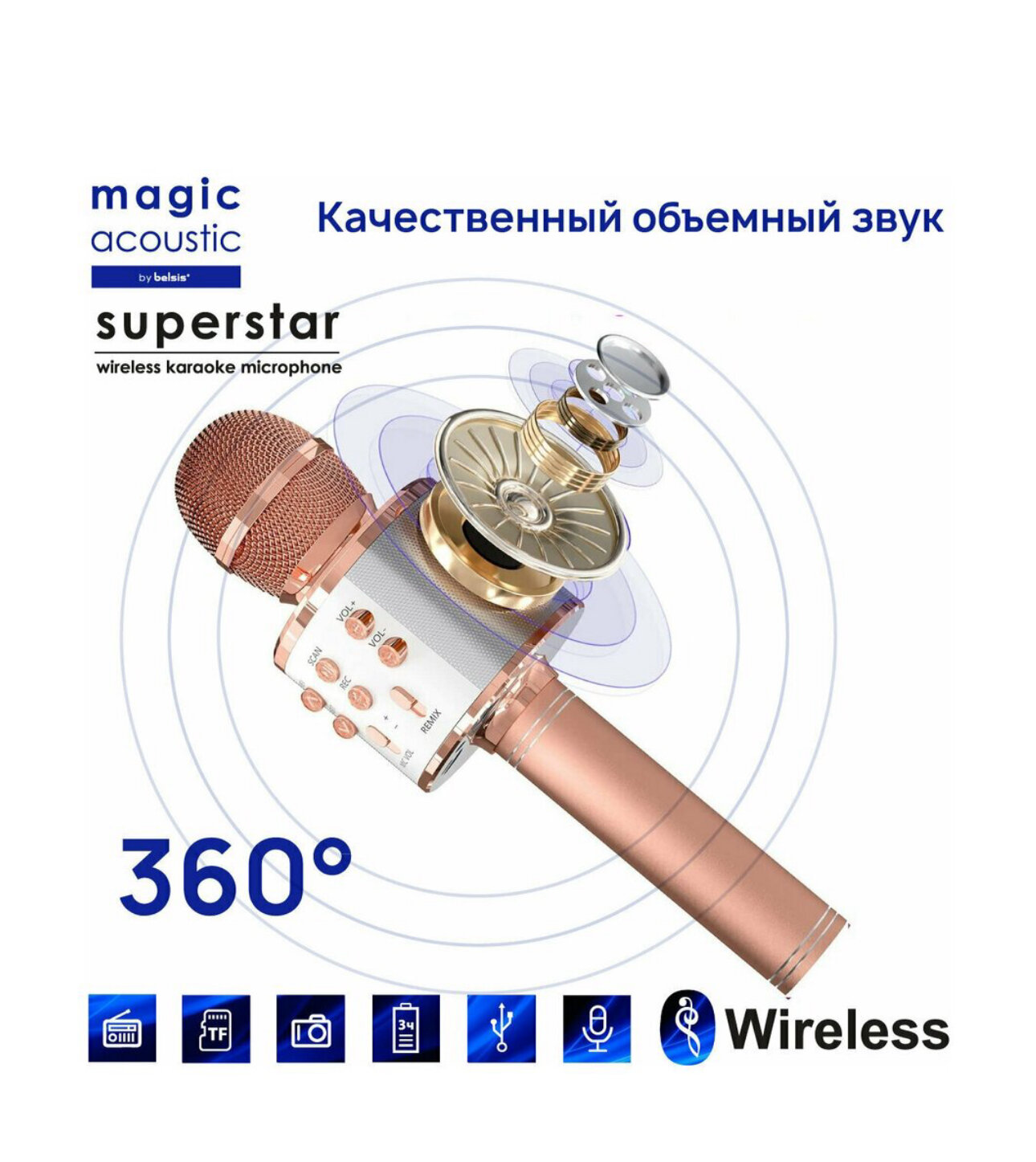 Караоке Микрофон Блютуз Magic Acoustic Superstar/Bluetooth микрофон для Девочек Мальчиков Взрослых/Караоке 3-в-1/MA3001RGD Superstar, розовое золото