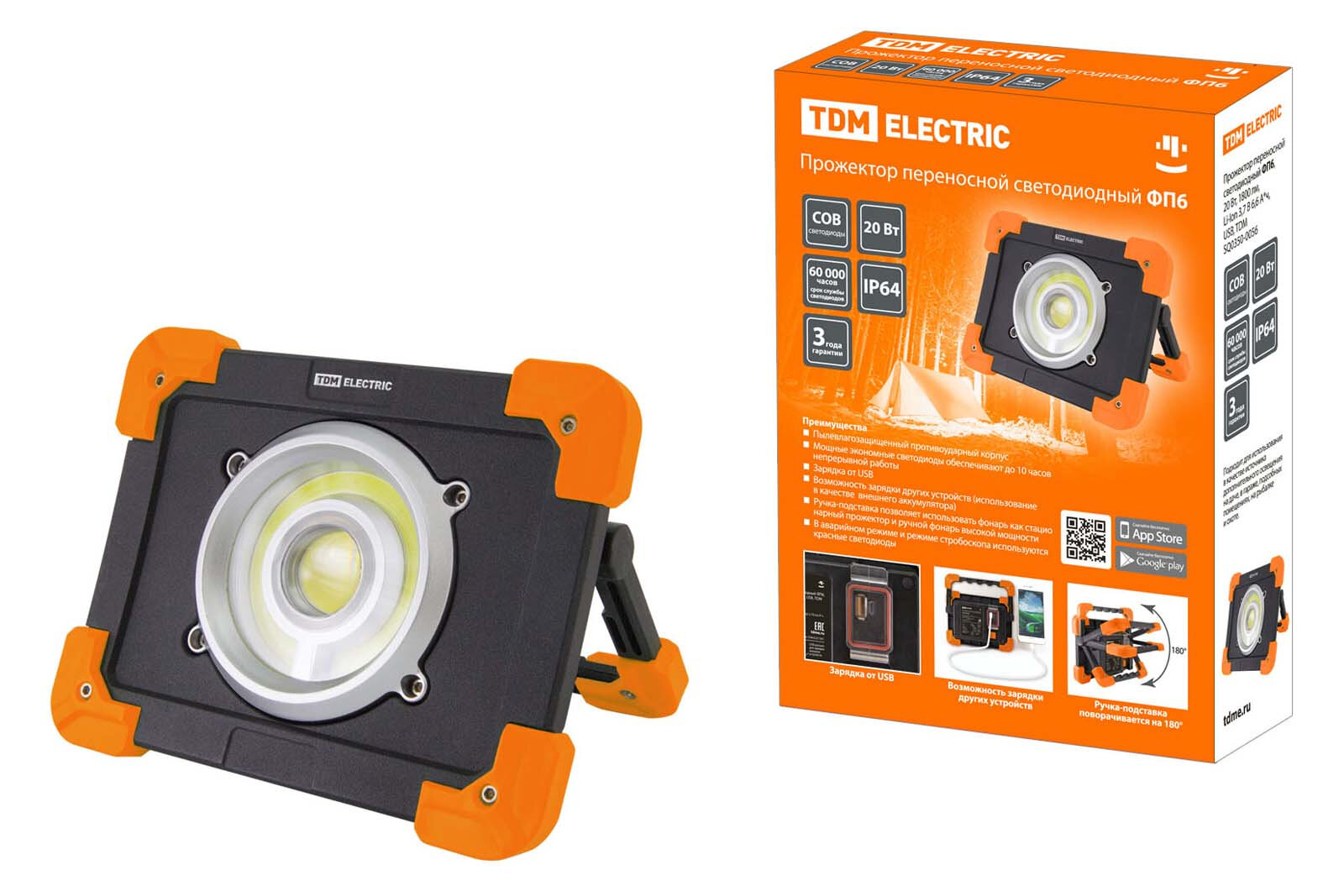 Купить Переносной светодиодный прожектор TDM ФП6, 20 Вт, 1800 лм, Li-Ion 3,7 B 6,6 Aч, USB, SQ0350-0056