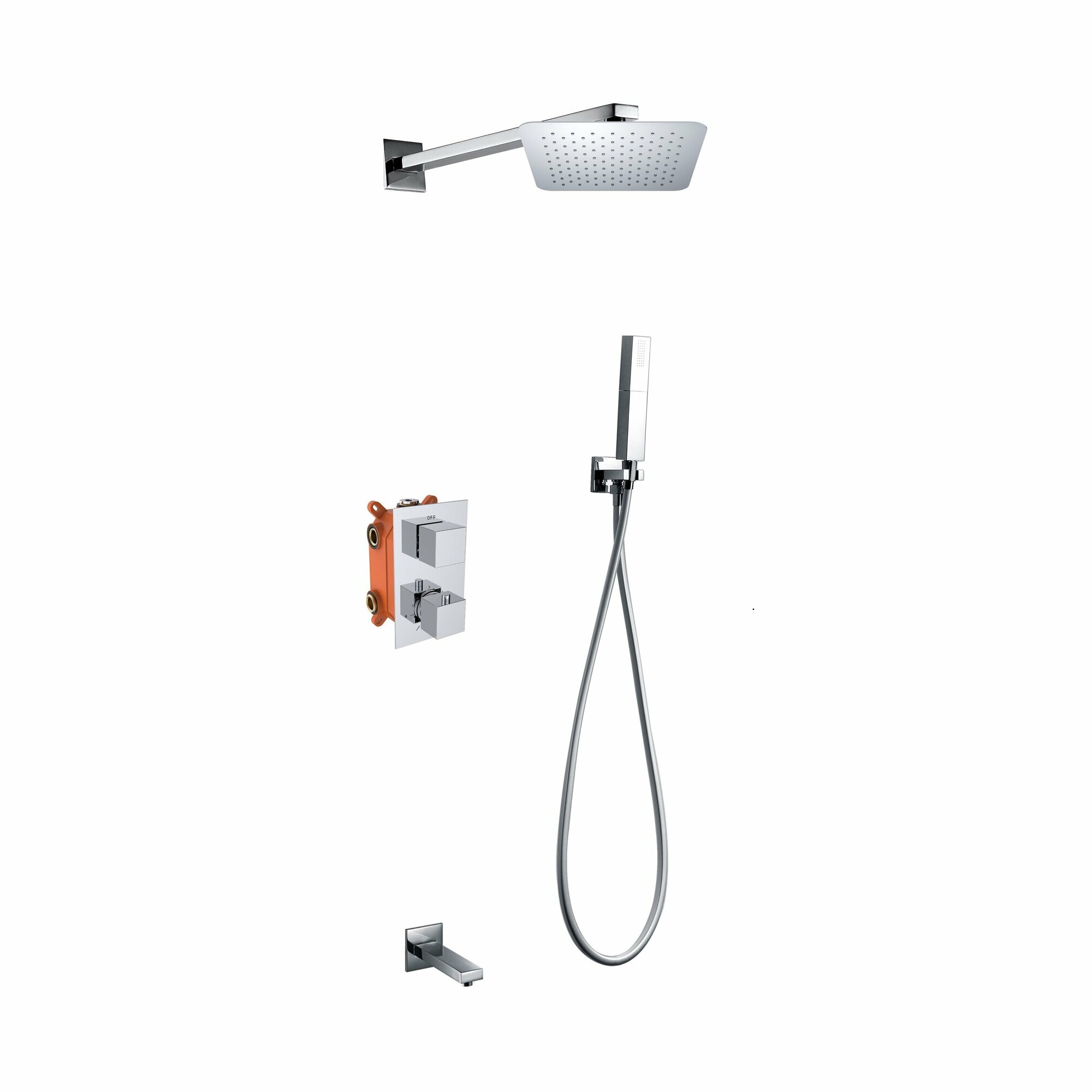 | Комплектация | термостатический смеситель со встраиваемым механизмом / излив / латунный двухрежимный ручной душ / гибкий полимерный шланг / верхний душ |