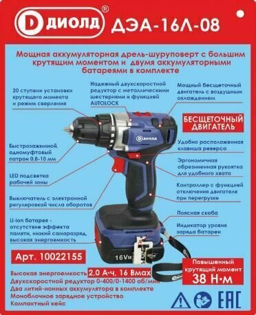 Дрель-шуруповерт аккумуляторная диолд ДЭА-16Л-08, кейс, бесщеточный двигатель, 2 аккум., 2 скорости, плавное изменение оборотов, реверс, Li-ion, 16В, 0-1400 об/мин