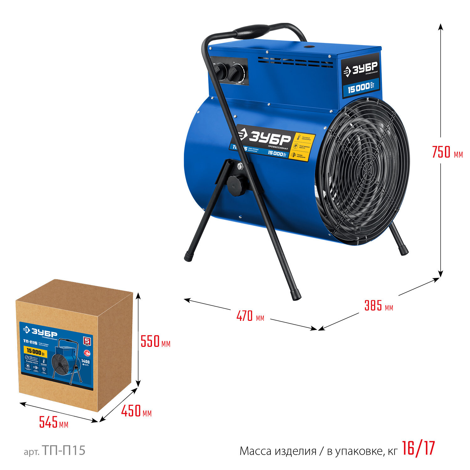 ЗУБР 15 кВт, электрическая тепловая пушка, Профессионал (ТП-П15)