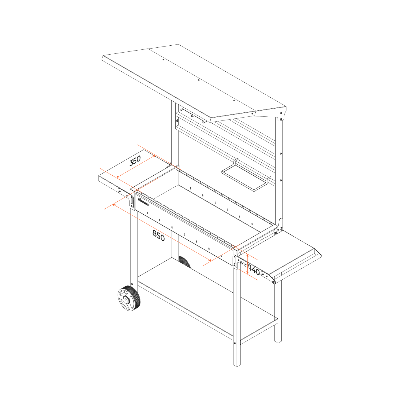 | Дополнительная информация | две полки для размещения продуктов и инструментов, крыша-навес с полками и крючками; габариты топки: 92,6 × 39 × 14,5 см; ширина рабочей зоны 85 см |
