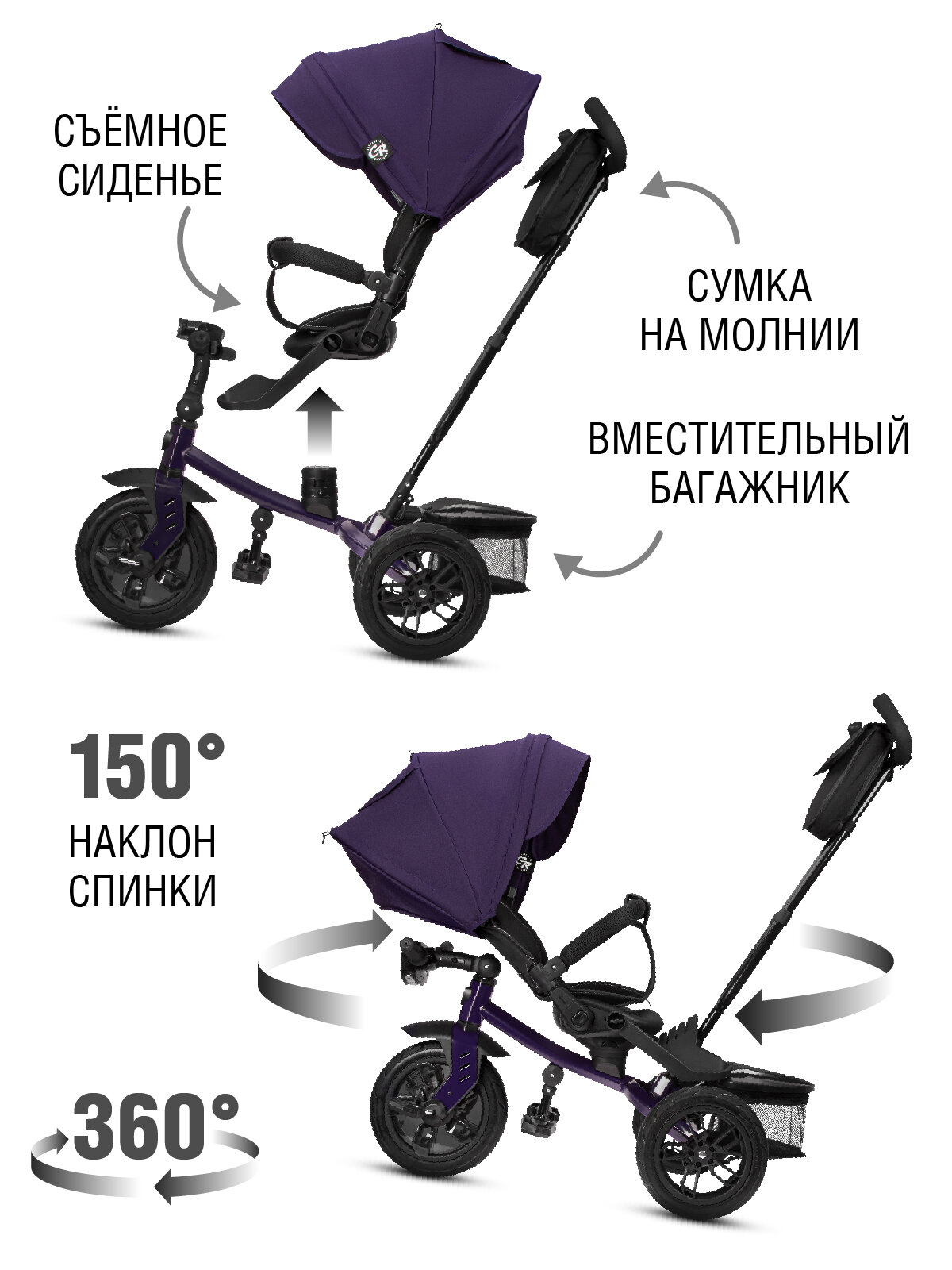 Велосипед детский трехколесный ТМ CITY-RIDE LUNAR, пятиугольная рама, складная крыша, надувные колеса 12"/10", поворот сиденья, CR-B3-10CM