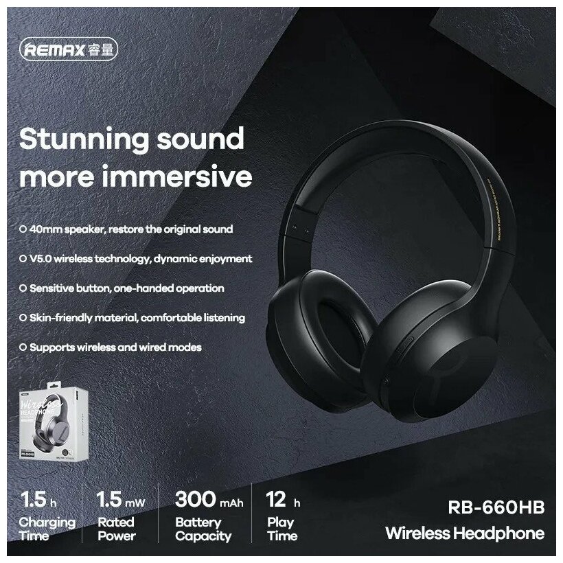 Беспроводные наушники Bluetooth Remax RB-660HB, накладные, черные, 1 шт