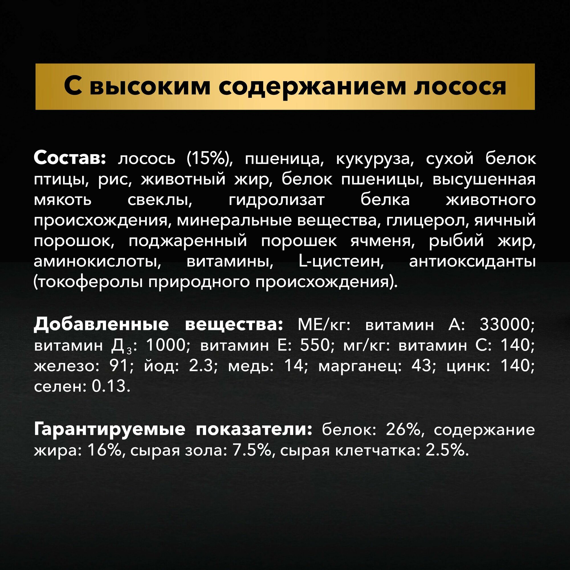 | Состав | Лосось (15%), пшеница, кукуруза, сухой белок птицы, рис, животный жир, пшеничный глютен, высушенная мякоть свеклы, гидролизат белков животного происхождения, минеральные вещества, пропиленгликоль, яичный порошок, ячменная мука, рыбий жир, аминокислоты, витамины, консерванты, L-цистеин, антиоксиданты (токоферолы природного происхождения). |