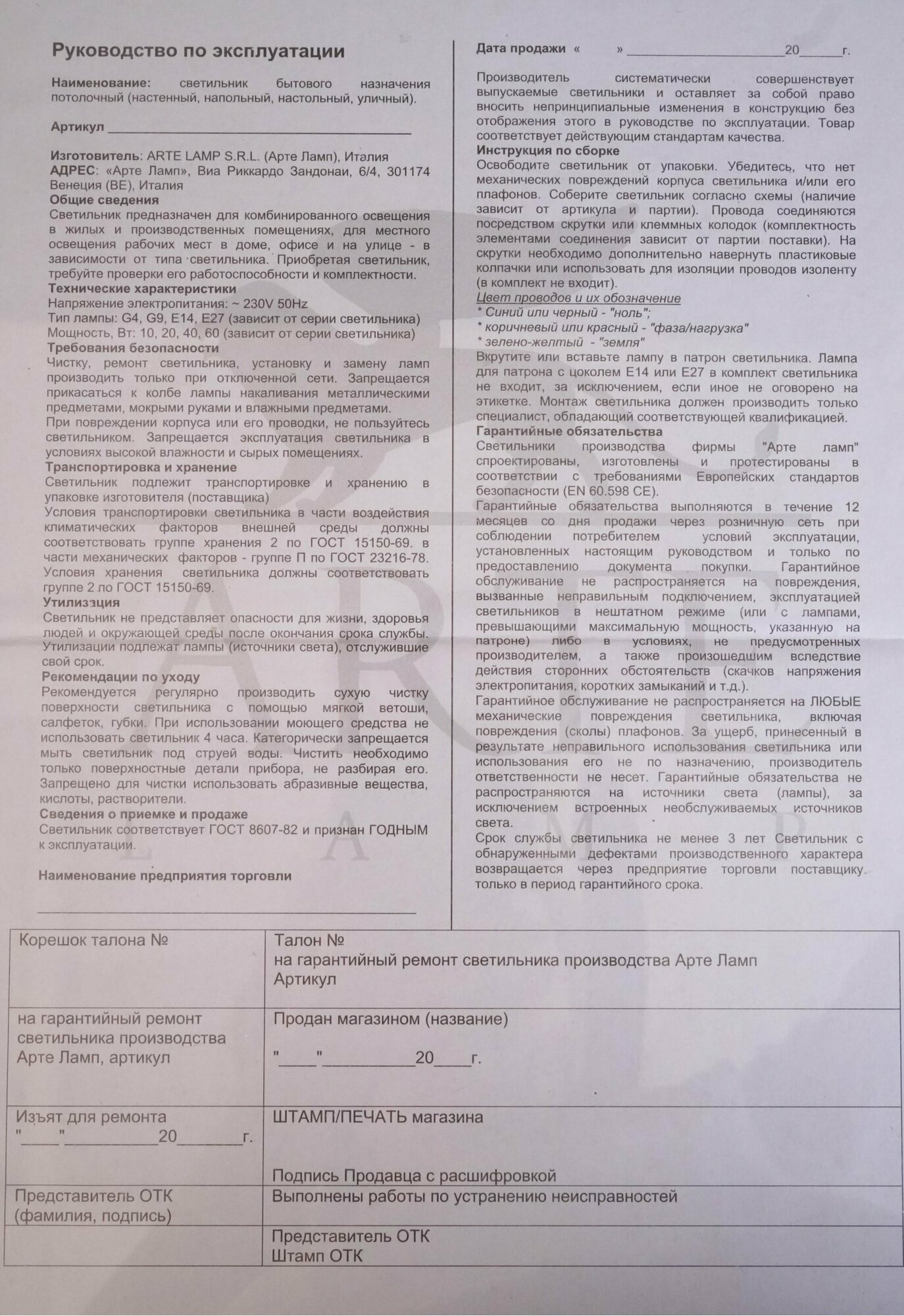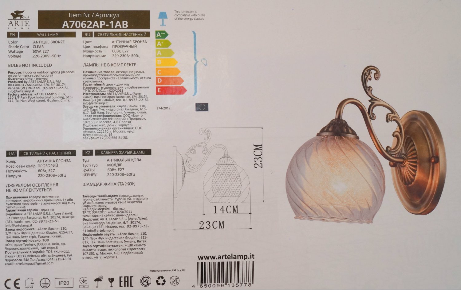 | Комплектация | бра Arte Lamp A7062AP-1AB |