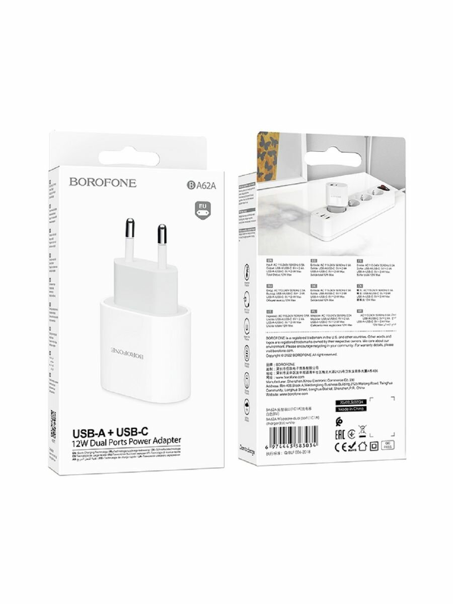 Сетевой адаптер питания Borofone BA62A White зарядка 1 порт USB-C + USB-A, 2.4А белый