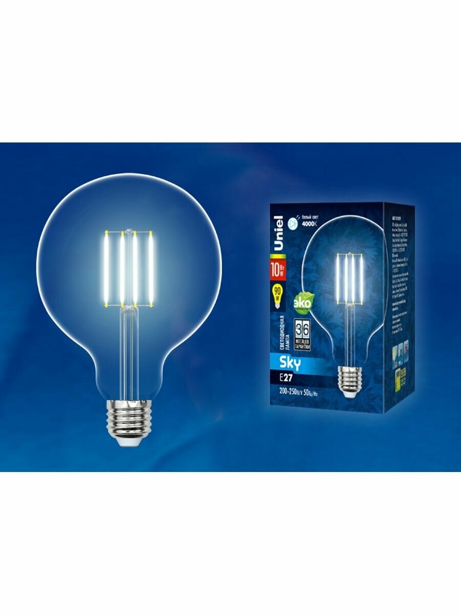 Купить Лампа светодиодная 10 Вт E27 G125 3000К 850Лм прозрачная филамент 200В шар SKY (LED-G125-10W/WW/E27/CL PLS02WH) 10534 Uniel