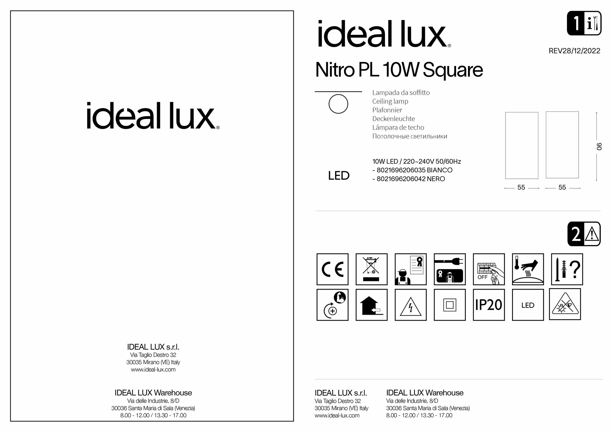 Купить Светильник потолочный ideal lux Nitro PL Square 10Вт 1100Лм 3000К IP20 LED 230В Белый Металл 206035.