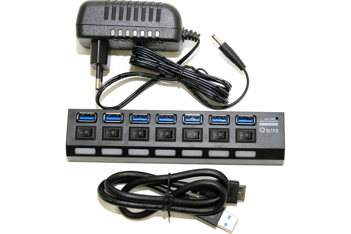 Разветвитель USB3.0 5Bites HB37-303PBK хаб - концентратор 7 портаов USB3.0 + выключатели + блок питания линейка - чёрный