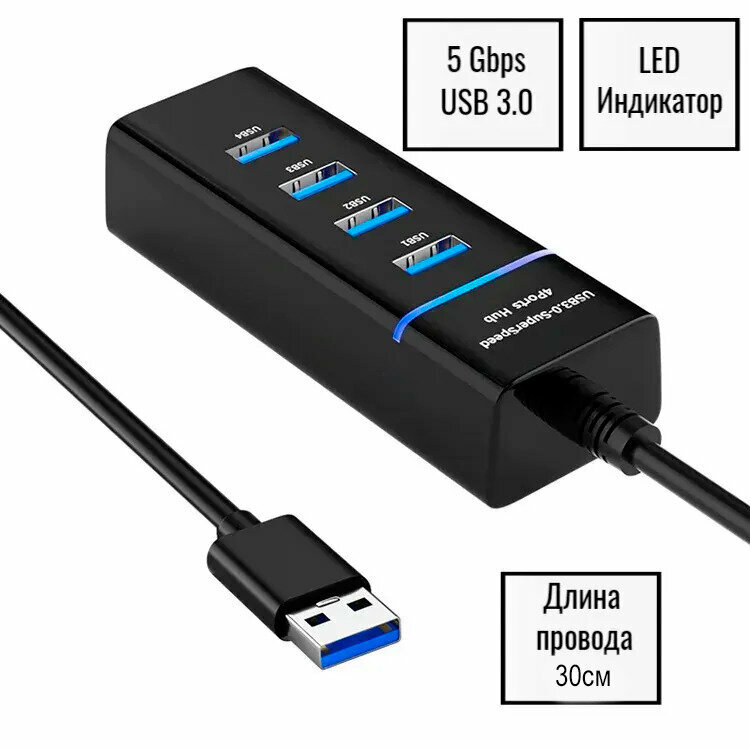 USB-концентратор MRM-POWER (разветвитель HUB) на 4 порта USB 3.0 с LED-подсветкой, черный