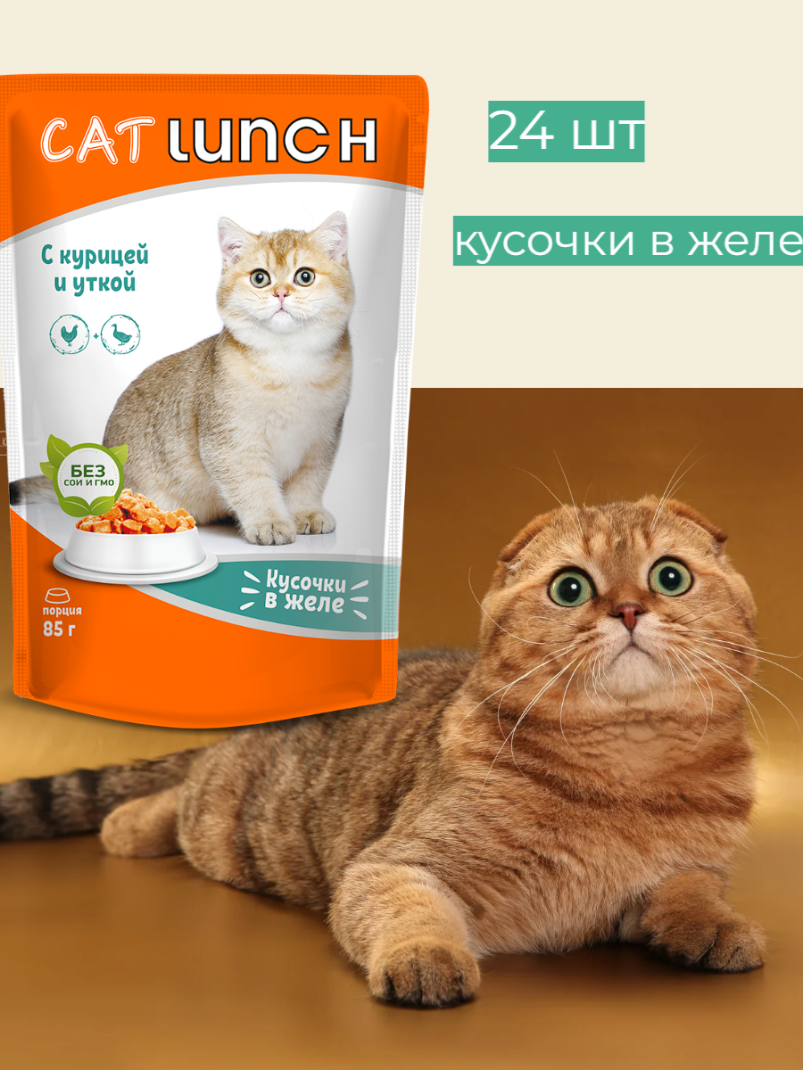 Влажный корм для кошек Cat Lunch кусочки в желе Курица и Утка, паучи по 85г (24 шт. в упаковке)