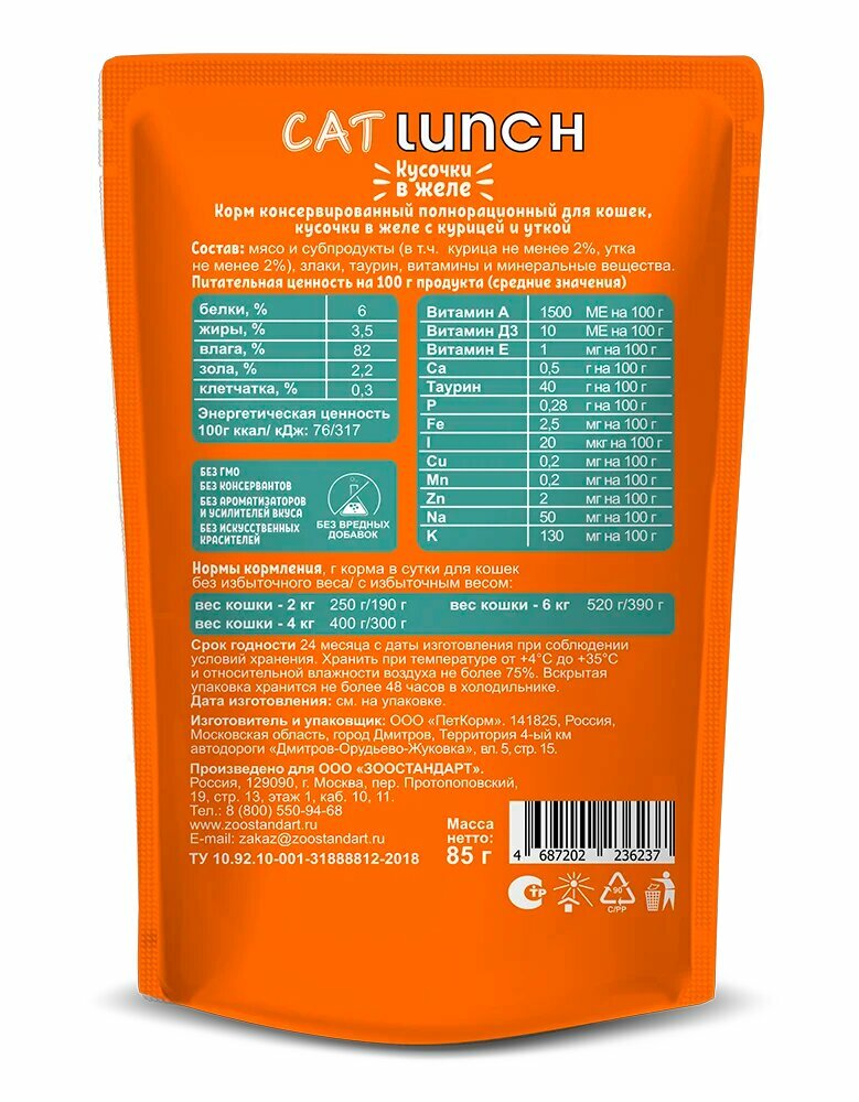 Влажный корм для кошек Cat Lunch кусочки в желе Курица и Утка 85г (24шт) интересное: