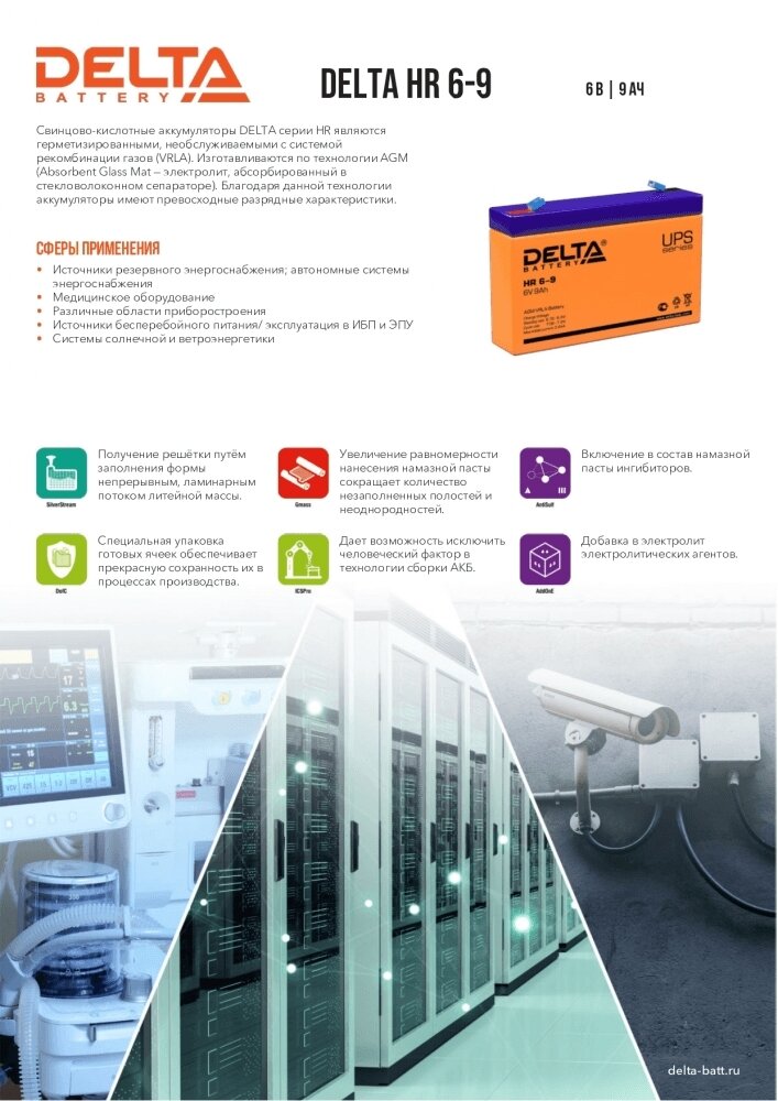 Delta UPS HR 6-9 (6V / 9Ah) Батарея DELTA серия HR, HR 6-9, напряжение 6В, емкость 9Ач (разряд 20 часов), макс. ток разряда (5 сек.) 135А, макс. ток заряда 2.55А, свинцово-кислотная типа AGM, клеммы F1, ДxШxВ 151х34х94мм., вес 1.37кг., срок службы 8 лет.
