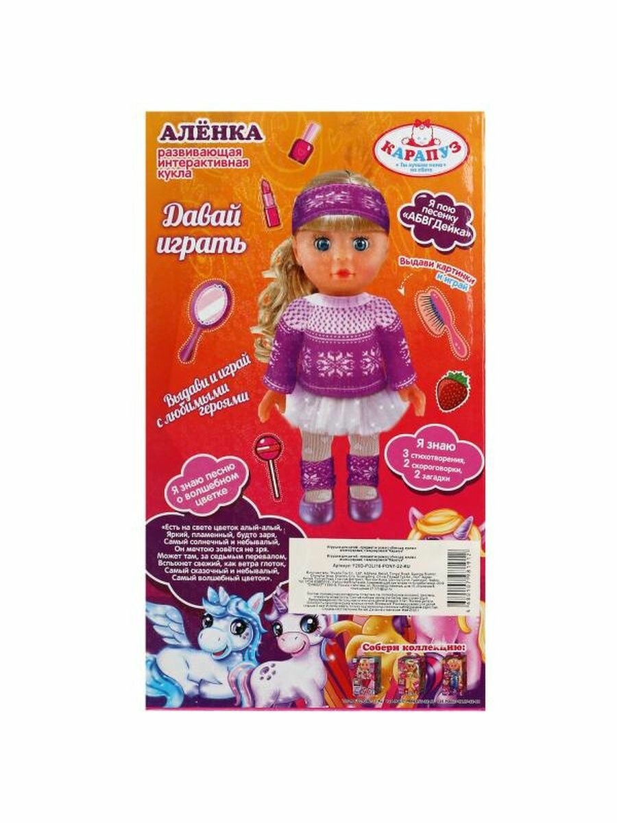 Кукла озвуч АБВГДЕЙКА песня Аленка 20см, закр глазки, 100 фраз, 3 акс карапуз в кор.48шт интересное: