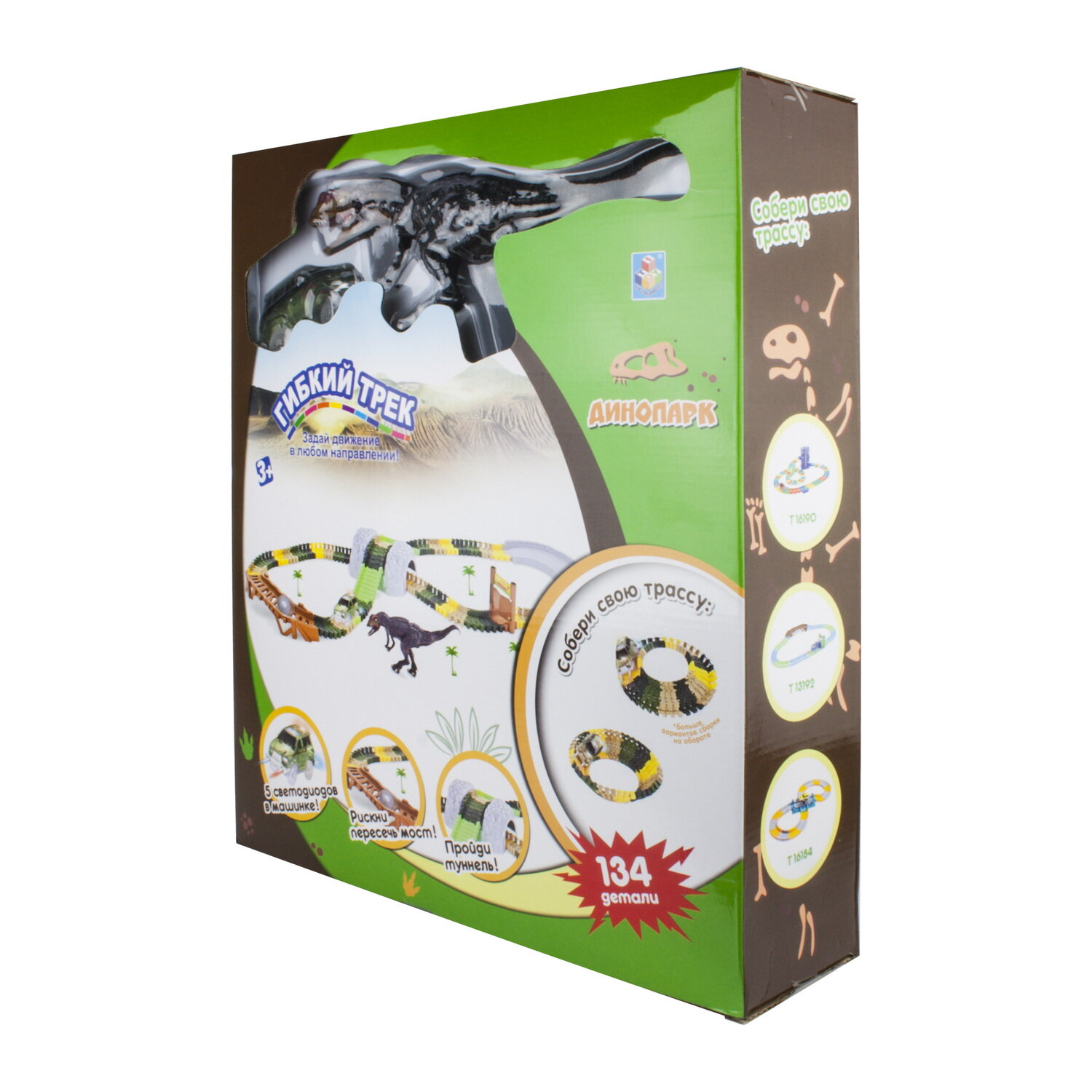 1toy гибкий трек "Динопарк" 134 дет, туннель, ворота, мост, шарик, 1 бол. динозавр, 1 маш. с 5 ламп.