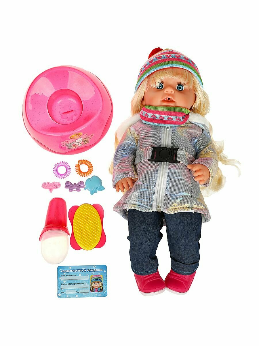 | Комплектация | кукла, горшок, бутылочка, пустышка, подгузник, расческа, 3 заколки, 2 резинки |