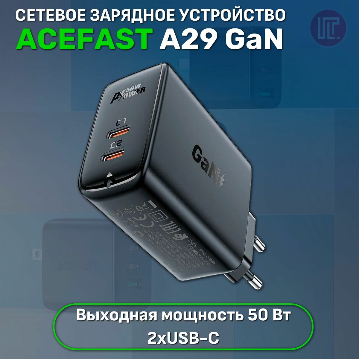 Зарядное устройство ACEFAST A29 PD50W GaN USB-C+USB-C dual port charger (EU). Цвет: черный
