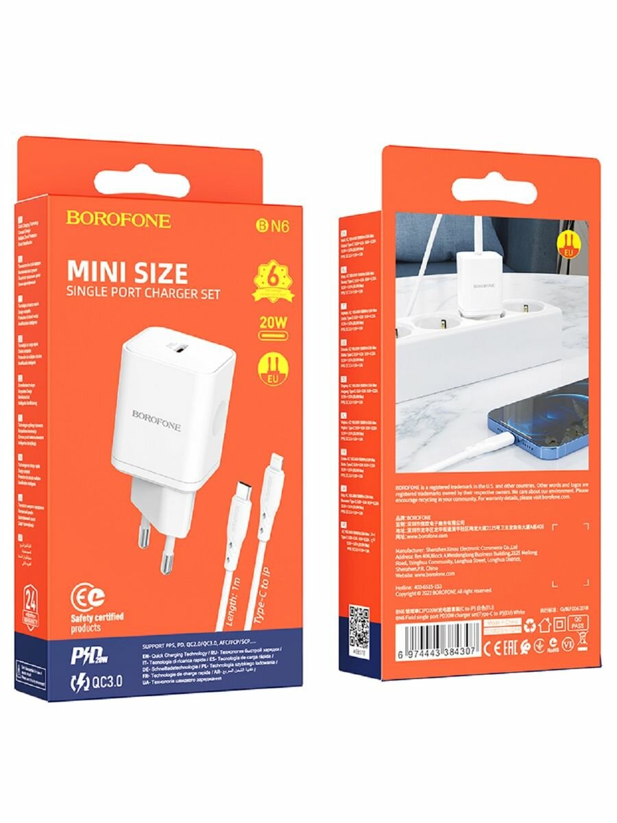 Сетевое зарядное устройство BOROFONE BN6 Field 1xUSB-C PD20W, 3A + кабель USB-C Lightning 8-pin, 1м (белый)