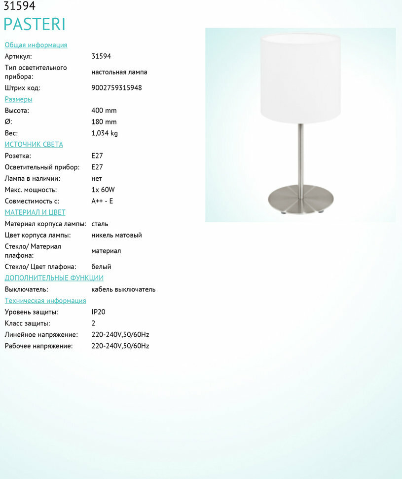 Ниже Вы можете прочитать отзывы на Настольная лампа 31594 EGLO, ознакомится с подробными характеристиками, посмотреть интересные обзоры и фотографии на Настольная лампа 31594 EGLO.
