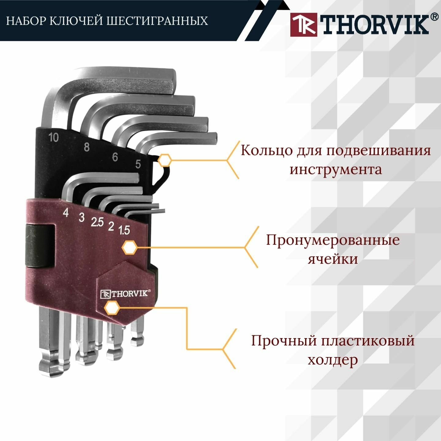 Набор ключей торцевых шестигранных коротких с шаром, H1.5-H10, 9 предметов Thorvik