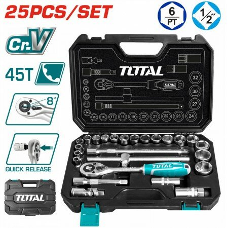 Набор торцевых головок, 25 шт 1/2", с трещоточным ключом TOTAL